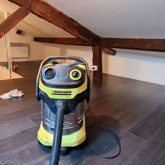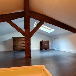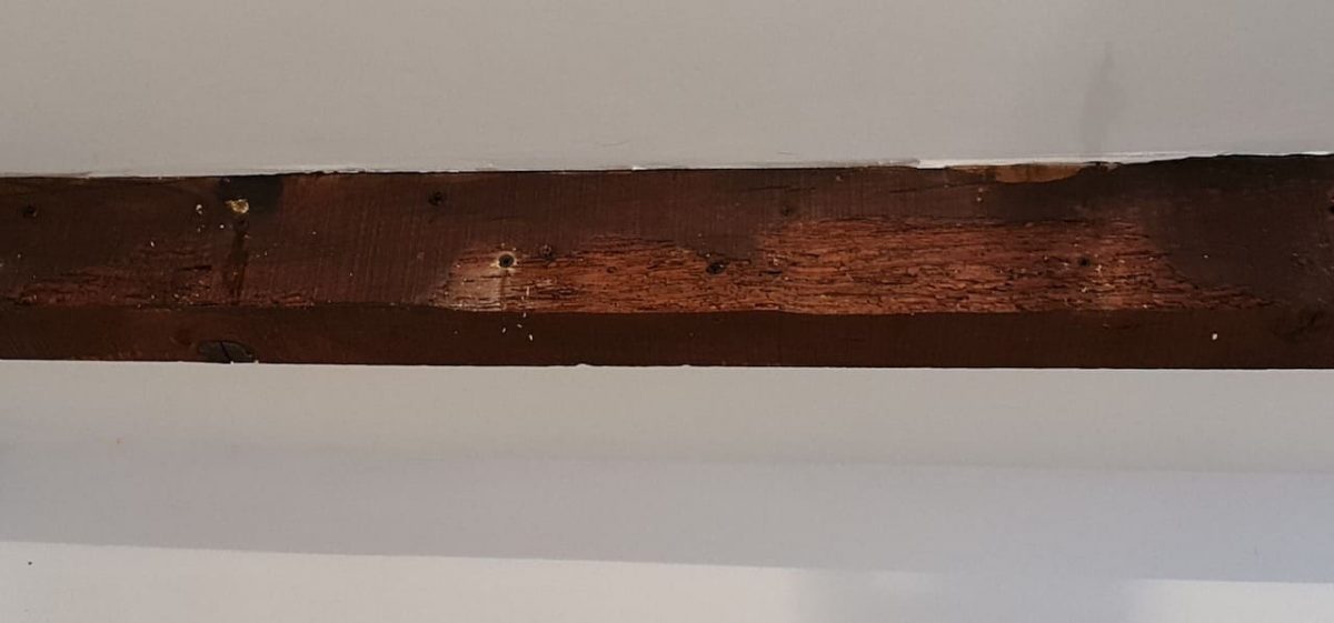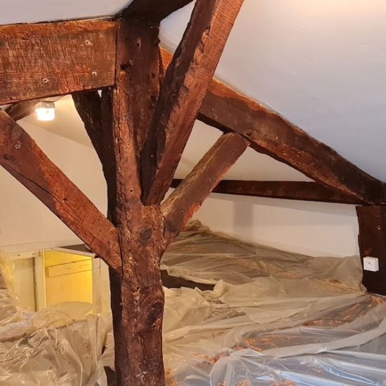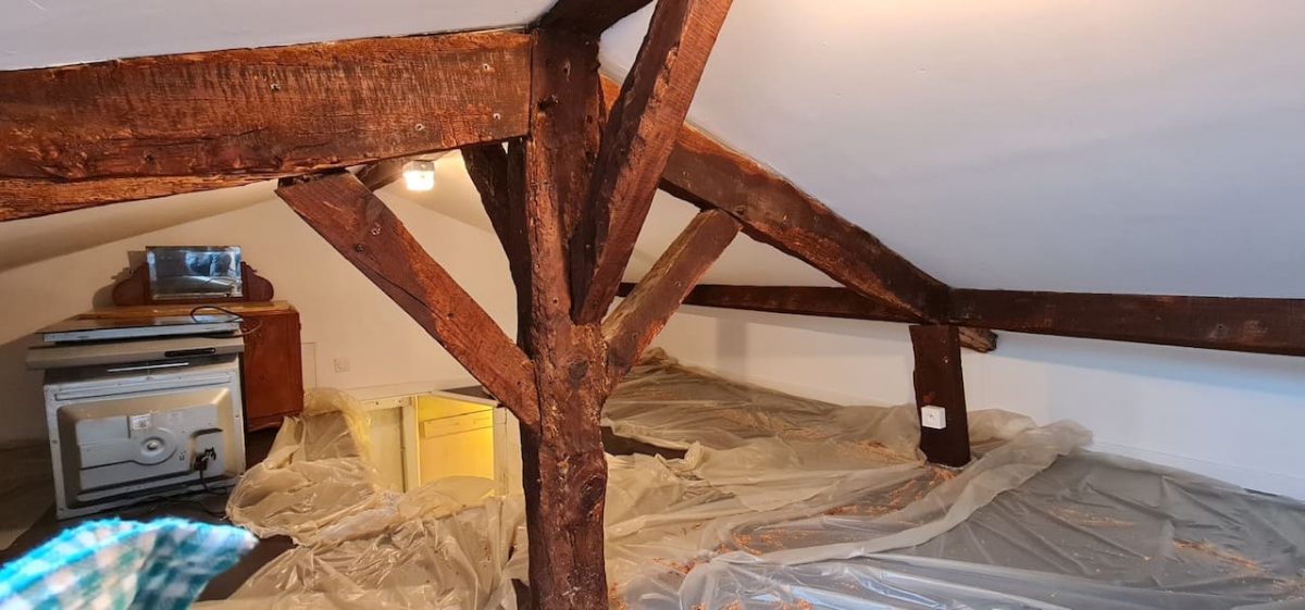 Les travaux en milieu habité ont consistè à protéger toute la zone pour ensuite pouvoir injecter le produit actif contre les insectes directement au coeur des poutres en bois.